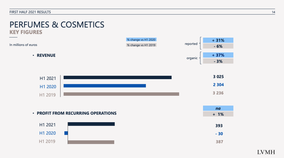 而香水与美妆板块2021上半年销售30.25亿欧元(约合人民币232亿元),实现了37%的有机收入增长,但比起2019同期依旧下滑了3%。