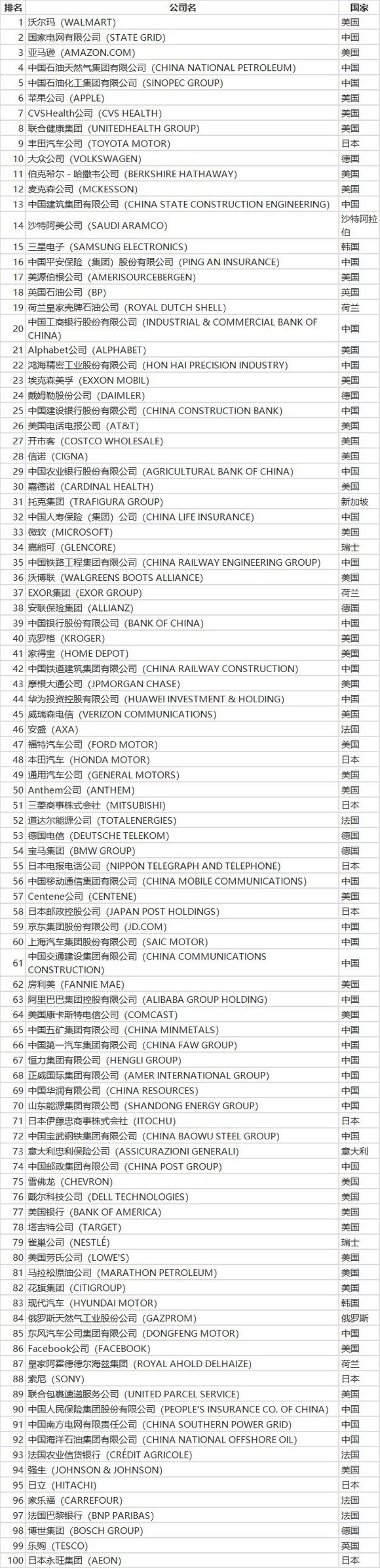 8月2日,美国《财富》杂志发布了最新的世界500强排行榜。沃尔玛连续第八年成为全球最大公司(同时也是最大雇主:员工达230万);中国的国家电网公司上升至第二位,亚马逊首次进入前三,苹果公司前进至第6位。