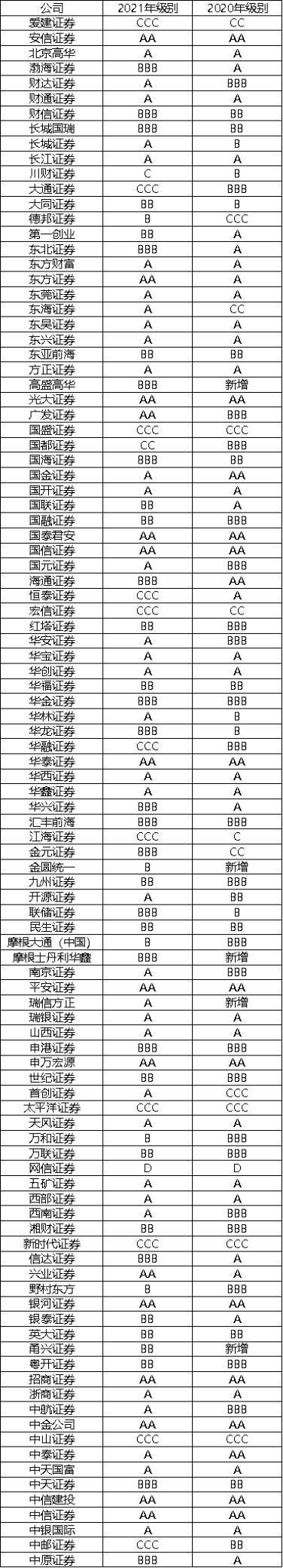 7月23日晚间,证监会公布了2021年证券公司分类结果。根据《证券公司分类监管规定》,经证券公司自评、证监局初审、证监会证券基金机构监管部复核,以及证监局、自律组织、证券公司代表等组成的证券公司分类评价专家评审委员会审议,确定了2021年证券公司分类结果。