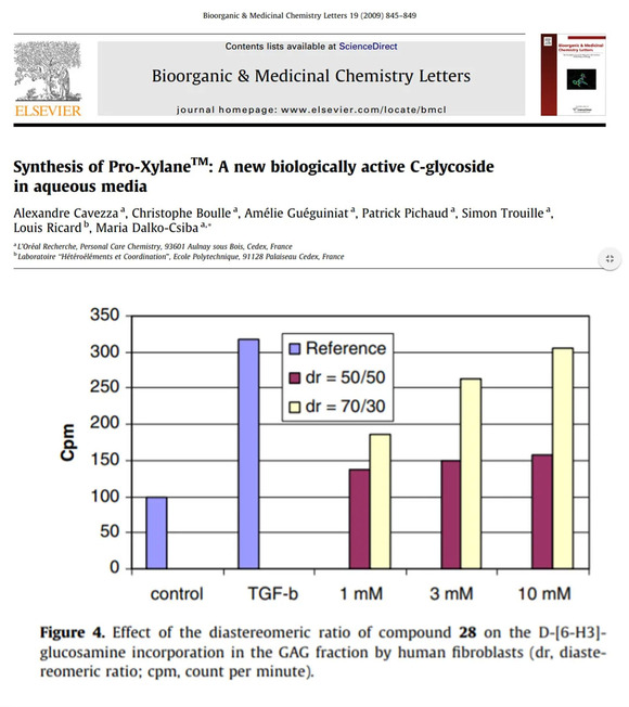 根据欧莱雅对玻色因作用机制的研究,发现其与维A醇、胜肽略显不同。玻色因主要是通过修复糖胺聚糖和蛋白聚糖, 刺激粘多糖(GAGs)和蛋白多糖(Proteoglycan)的生成,以达到修复细胞外基质。简单来说,能够增强皮肤间的韧度,恢复皮肤弹性。这种特殊的机理,也导致在抗衰老成分中,玻色因的温和、安全程度较高。