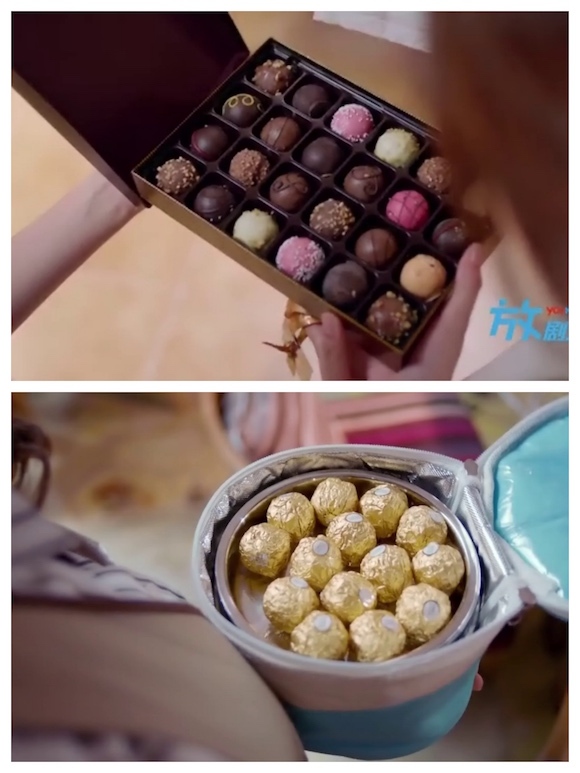 第一集中,富二代曲筱绡刚搬到22楼就送给邱莹莹和关雎尔一大盒歌帝梵(GODIVA)巧克力。两人随即拿出手机搜狗了一下,显示这盒巧克力的价格在1000元左右。到了本季末尾,邱莹莹未来的男朋友应勤也送出了一盒巧克力,但却是费列罗,这么看,也是颇为节省的耿直程序员小伙。