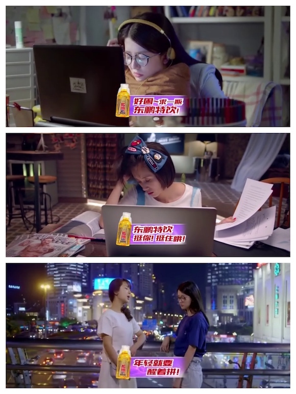 如果你在优酷上看《欢乐颂》,那可能还会看见这款饮料的广告。每个需要打鸡血的场景都能看见这款饮料缓缓浮现。这是一个类似于红牛的功能性饮料,除了表现形式有点抢镜不讨喜,其实场合出现得也算贴合。