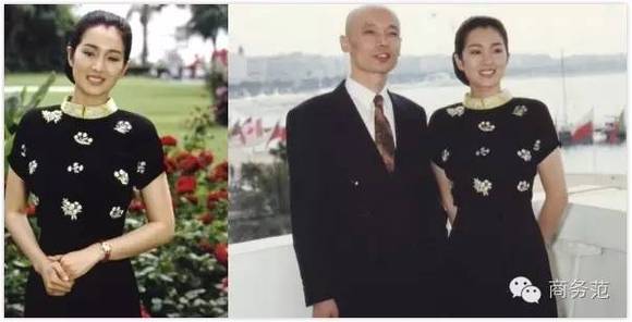 一身黑色缎面中式礼服,配上亮棕披肩,是不是显得贵气十足呢。可是旁边张国荣的头发是怎么回事...( )