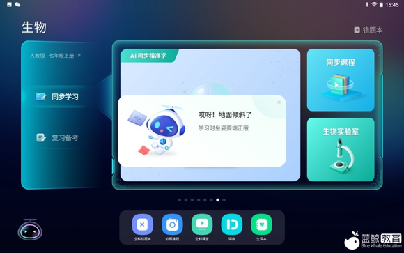 T10学习机配备AI同步精准学功能,覆盖小学、初中、高中全年级,包括数学、英语、物理、化学、生物等科目,人大版、北师大版、苏教版、沪科版、湘教版等教材版本基本都涵盖其中。