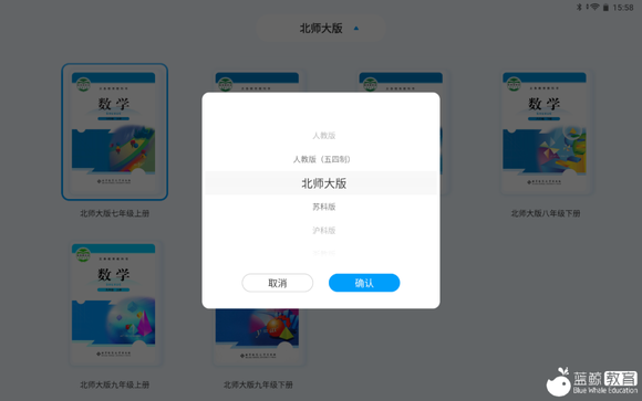 我们以七年级数学为例,滑动桌面进入数学学习界面,点击屏幕左侧“数学”科目下面的教材版本字条,可以切换学生所使用的教材版本,随后点击屏幕中间的AI同步精准学前往学习。