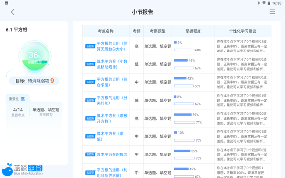 报告详细分析了刚刚答过的十道题,分别对应哪些知识点、考频、考察题型、掌握程度,并给出个性化的学习建议。