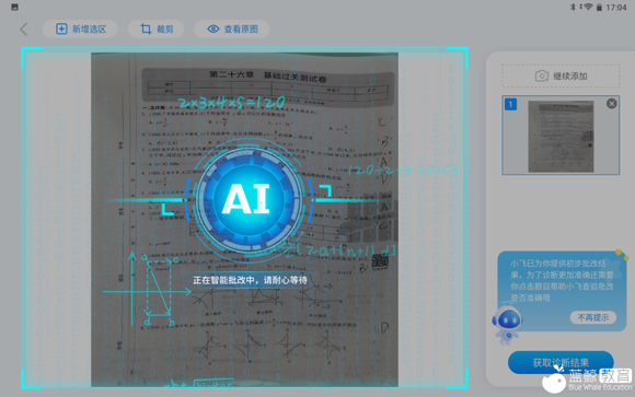 通过“小飞小飞”的口令,呼唤出语音助手,在发出“帮我批改数学试卷”的指令后,将数学试卷或者练习册根据提示摆放在学习机面前,T10的前置摄像头可以扫描试卷,并在很短的时间内给出批改结果。