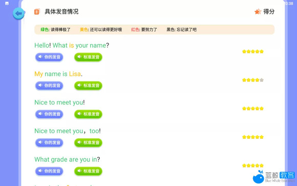 学生跟读完之后,可以清楚地看出自己的哪句话中的哪个词读的不标准或者漏读,可以通过每一句的标准发音和自己的发音重听对比,快速找到自己的薄弱点。