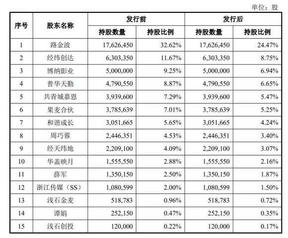 2021年8月30日,果麦文化(301052.SZ)在深交所创业板正式亮相。根据招股书,IPO前路金波共计持有果麦文化32.62%的股份。而除路金波之外的第二大自然人股东周巧蓉,其持有果麦文化4.53%的股份。