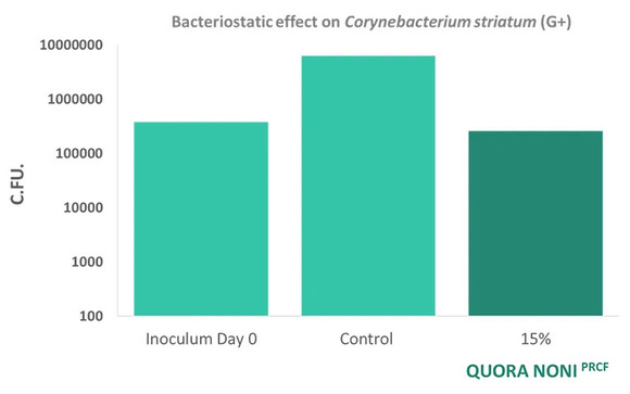 相关研究证明了该原料对粉刺和头皮屑的功效,以及具有抑制体味和指甲护理的功能。人的汗水是无味的,但与细菌纹状体棒状杆菌(C. striatum)的相互作用会产生某些分子,这些分子会产生过多和强烈的气味。Quora Noni能够抑制C. striatum的生长和繁殖,并不是直接杀灭它们,而是使这种细菌的种群保持在控制之下。
