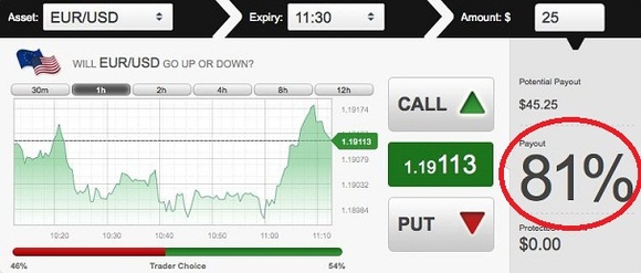在下单前,二元期权的盈利和亏损就是公开的。平台上有一个功能叫做“收益率”,它会让我们事先看到一个价内期权的盈利是多少。如果看涨欧元/美元,那么平台上显示的收益率是很正常的。假设期权的收益率是81%,那么你的盈利也就是投资金额的81%。