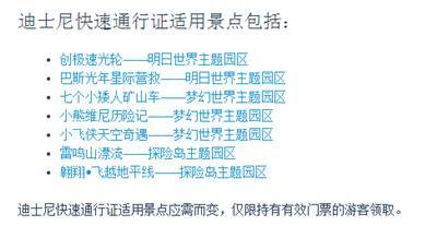 上海迪士尼也将提供快速通行证的服务,针对热门景点排队时间较长,领取快速通行证后可在指定时间等候比较少的时间进入。试运营期间没有开放快速通行证,还不知道能不能起到缓解疏散排队压力的作用。取得快速通行证同样需要有秩序地排队,一定时间后才能领取第二张,执行效果有待检证。东京迪士尼乐园的攻略上有一条就是教人如何在第一时间领取热门项目的快速通行证,然后再迅速排一个自己喜欢的项目,掌握这些技巧合理安排好时间,可以在相同时间内比别人多玩不少东西。