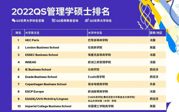 9月9日,全球商学院分析研究机构QS(Quacquarelli Symonds)发布2022全球MBA(工商管理硕士)的最新排名。