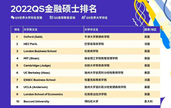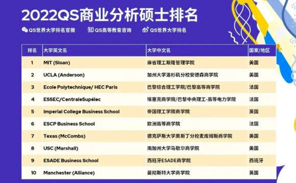 与MBA排名一同发布的,还有2022QS商科硕士排名,包括商业分析硕士、金融硕士、管理学硕士、市场营销硕士和供应链管理硕士五大商科硕士专业。
