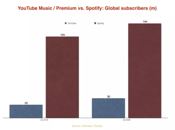 可以看到,二者的增速在缩小,更重要的是YouTube Music增速更猛,增长空间更大。
