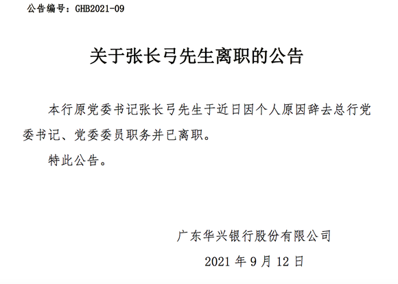 9月12日,广东华兴银行发布公告称,张长弓于近日因个人原因辞去总行党委书记、党委委员职务并已离职。