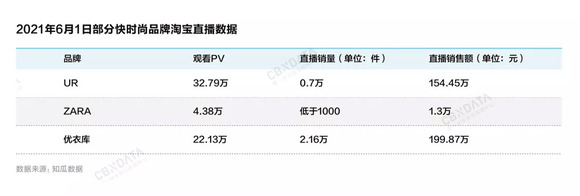 2020年初,UR的淘宝直播间就保持两至三天直播一次的频率,每场平均观看量3万左右,截至2021年6月已累计直播200余场。与UR相似,ZARA、优衣库等快时尚品牌也是在疫情期间大力发展起电商渠道,2021年618大促期间,UR与优衣库618开门红(6月1日-6月3日)首日直播销售额都在150万以上,店铺整体销售额占据天猫服饰鞋包整体销售额前5名。