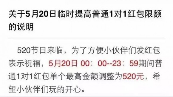 5.20节日来临,为了方便小伙伴们发红包祝福,5月20日0:00分—23:59分期间普通1对1红包单个最高金额调整为520元,希望小伙伴们玩的开心。
