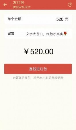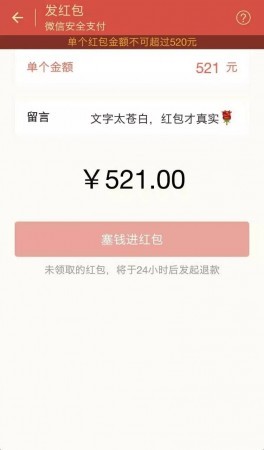 原本微信红包表白只需要52.0元甚至5.20元,可是万万没想到,微信居然临时调整了微信红包的限额,单个红包上限调整为520元,表白的成本瞬间被拉高。