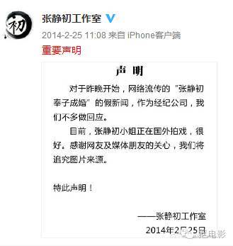2014年2月,有网友曝出顾长卫和张静初在民政局排长龙的照片,并称张静初奉子成婚。曾有媒体报道,张静初与蒋雯丽老公顾长卫偷情,并被捉奸在床。