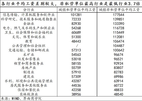 城镇地区非私营单位包括国有单位、城镇集体单位、联营、股份制、外商投资、港澳台商投资等单位。城镇地区私营单位包括私营有限责任公司、私营股份有限公司、私营合伙企业和私营独资企业。上述平均工资=报告期实际支付的全部就业人员工资总额/报告期全部就业人员平均人数。2019年,全国私营企业就业人数为22833万人,其中,城镇私营企业就业人数为14566万人;城镇非私营单位就业人数则为17162万人(非私营单位各行业就业人数合计)。