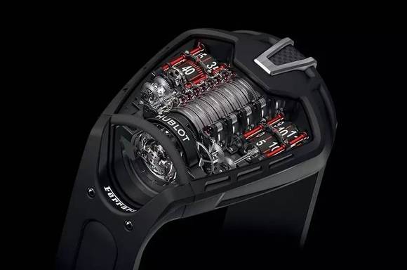 还有宇舶与法拉利汽车合作的La Ferrari,外形酷似法拉利V12缸发动机,它也拥有超长动力——11个发条盒串联——可以提供50天动力存储!