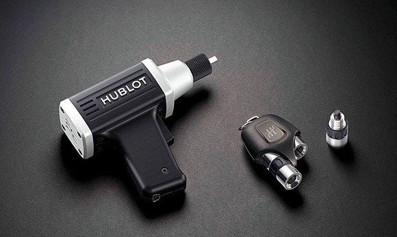 增加发条的长度和数量,同时也带来了腕表尺寸、体积随之增加的不便,而且给这么长、这么多发条上劲,得借助专用工具,比如La Ferrari提供了电动上链枪。