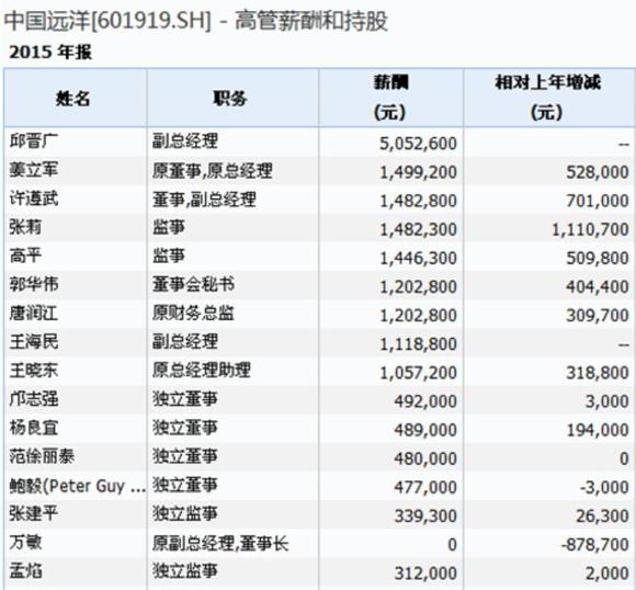 其中,中国远洋的高管中有11位加了薪。这些人中除独立董事、独立监事外,其余高管加薪幅度均超过30万元,加薪后的薪酬普遍在100万元以上。其中监事张莉加薪幅度最高,由2014年的37.16万元上升至2015年的148.23万元,年涨工资111.07万元,增幅高达3倍。详见下表。