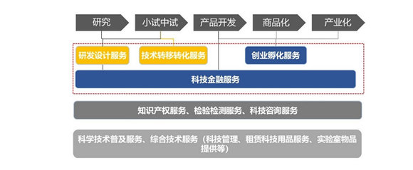 科技服务业也是整个科技创新体系的一个重要组成部分,主要是服务于整个科技创新的全链条,从研究、小试、中试到最后的产业化整个阶段。目前在国家的角度来讲,明确划分了九大领域,根据科技创新以及科技成果转化的相关程度可以划分三大层次:第一个是核心层,主要包括研发设计、技术转移转化、创业孵化以及科技金融服务4大领域,这是整个科技服务业里面最核心的部分,相对来讲它的门槛也是最高的;其次是为科技创新提供支撑作用的,包括知识产权服务、检验检测以及科技咨询服务;最后较弱的就是科学技术普及以及综合技术服务的相关业态。