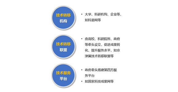 目前我国形成了机构、联盟、平台这样的组织体系,可以提供多样化的服务。机构主要是一个服务主体,包括大学、科研机构、企业等。联盟主要是由高校、科研院所、政府牵头设立的,主要的目的是为了促进成果的转化,比如京津冀的技术人员联盟等。第3个就是平台类的,主要是由政府搭建的第4方服务平台。这些组织机构提供像技术评估、技术推广、需求搜索一直到沟通审核这样一揽子服务,它的核心价值就在于能够促进供需双方的需求高效对接,提高我国的科技成果转化率。