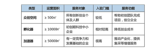 目前行业的主体类型,呈现民营、国有两大阵营,民营为绝对的玩家,包括地产企业、科技企业等多类主体。它的空间载体主要有三大类——众创空间、孵化器以及加速器,它们的共同特点是为初创团队和创业个人提供包括办公场地、社交空间、外包服务等多维度的服务体系,不同点是在于硬件、运营面积以及服务对象等。比如说众创空间,主要是服务于创立前创和业初期的企业;加速器主要是推动产业化的,它的硬件条件要求比较高,入驻门槛也比较高。所以看得出来,这三大空间载体是各有特色的。