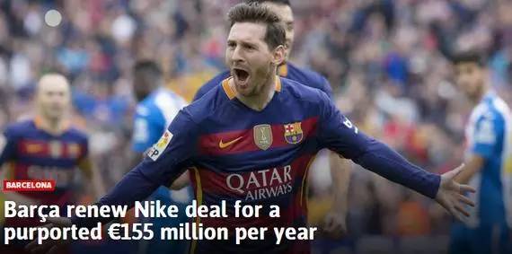 终于,在巴萨的“逼宫”之下,耐克做出了惊人之举。上周末,巴萨在官网宣布,球队与球衣赞助商耐克就续约问题达成一致。虽然具体的合同细节没有公布,不过西班牙媒体早已把此事翻了个底朝天。据《马卡报》的报道,按照新合同,巴萨在接下来的两个赛季分别能够获得8000万和8500万的赞助费用。从2018年夏天开始,巴萨每年将获得固定赞助金额1.05亿欧元,此外还可能获得额外的5000万欧元收入,也就是说每年最多能得到1.55亿欧元。