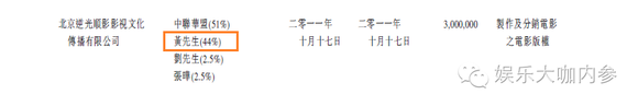 这些人背景之深,不多言。重要的是,他们把黄渤带着一起玩儿了。 把黄渤带入这笔交易的就是这个逆光顺影,而其实逆光顺影公司是在这笔交易前不久几个月才成立的。最重要的是,黄渤占的股份还不少,占到44%。