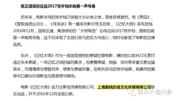 而电影是将在今年12月份上映的《记忆大师》,有万达影视参与投资,黄渤自己的上海瀚纳影视公司也是出品方之一,与此同时,黄渤参股的春天融和公司也是该电影的出品方之一。