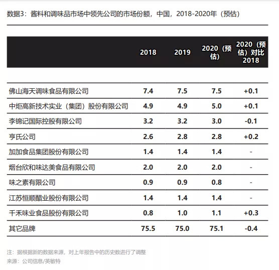 据小食代今天从英敏特处拿到去年12月发布的数据显示,在中国酱料和调味品市场,2019年,亨氏以2.8%的份额排名第四,排在前三的分别为海天(7.5%)、 中炬高新(4.9%)、 李锦记(3.2%)。2020年,亨氏份额预计仍为2.8%,与19年持平。