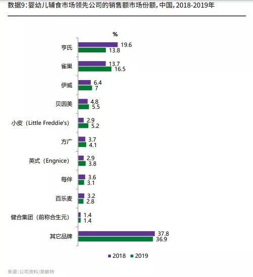 相比之下,其婴幼儿辅食的日子就有点难了。英敏特数据显示,2018年,亨氏仍以19.6%的份额排名中国市场第一。但到2019年,其份额下降至13.8%并被雀巢反超,失去了冠军宝座。同时,后面还有来自伊威、贝因美、小皮等品牌的奋起直追。