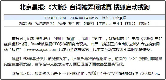 取名的时候,大家想起了2001年葛优主演的电影《大腕》里那句幽默台词“他们搜狐,我们搜狗,各搜各的!”一致认同将搜索引擎命名为“搜狗”。