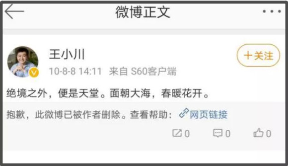 2010年08月8日,王小川和阿里巴巴敲定了入股的事项,他成功借马云的钱,击退360,保住了搜狗,当天下午,王小川在微博如释重负感慨道:“绝境之外,便是天堂。面朝大海,春暖花开”。