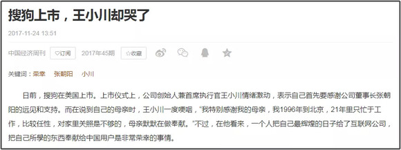 2017年11月9日,搜狗在美上市。王小川携母亲敲钟,在发表演讲时,情绪激动,语气哽咽。