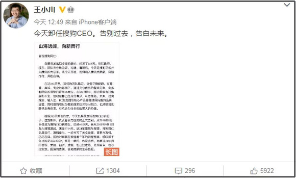 虽然王小川的搜狗没能完成“灭掉百度”的任务,但这不影响他的事业晋升。
