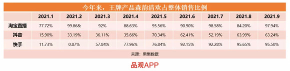 果集数据显示,今年以来,在淘宝直播上,该款产品贡献的营收占比一度超过99%。其中,有6个月的占比超过90%。快手平台亦然,自今年6月起,相关产品占比均超过90%。