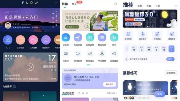 而国内主流的NOW冥想和FLOW冥想,主要是围绕着难易程度和使用场景来设计内容,如基础入门训练和系统性课程,或者针对不同的使用场景如缓解焦虑、帮助睡眠、提升专注度等。