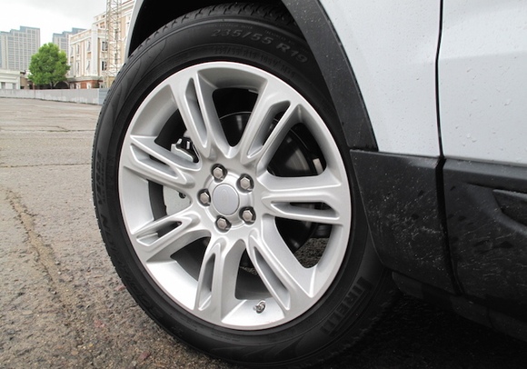 新款揽胜极光提供18、19和20吋的轮毂备选,同时新增了两种造型。本次试驾的HSE Dynamic致动版车型配备的是20吋轮毂,使用倍耐力245/45 R20蝎子胎(Pirelli Scorpion Verde All Season);另一配置试驾车型的轮胎规格则为235/55 R19(如下图)。