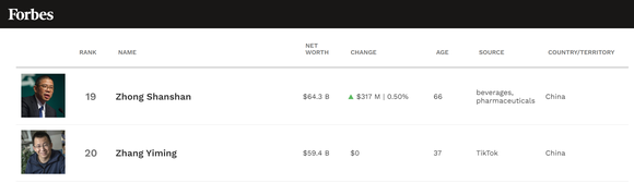 10月20日,据福布斯实时富豪榜显示,字节跳动创始人张一鸣身价达594亿美元(约合人民币3797亿元),位居福布斯全球富豪排行榜第20名,中国富豪榜第二名。在去年的福布斯全球亿万富豪榜上,张一鸣以162亿美元位居全球富豪排行榜第61位。