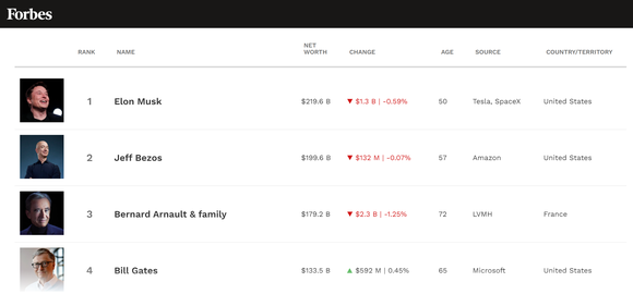 目前的福布斯全球富豪榜上,特斯拉CEO马斯克超过了亚马逊前CEO贝佐斯,以2196亿美元身家位居世界首富,比尔·盖茨排名第四,Facebook创始人扎克伯格排名第七。