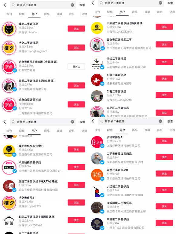 在抖音搜索“奢侈品二手直播”,不仅有像胖虎、妃鱼、红布林、只二这种垂直二奢电商平台在直播,一些在线下拥有二奢门店的小型商铺也纷纷在直播。