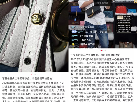一位小红书用户在其主页表示,“不要在胖虎二手买奢侈品,特别是贺某推荐的。”该用户写道,自己在胖虎鉴定中心直播间买了个芬迪水桶包,当时在直播间向主播两次确认是否有磨损等情况,主播一直说:“这款应该是陈列的包包,几乎没有使用痕迹。”然而该用户在收到货后却发现包包存在五金氧化严重、皮条两侧严重磨损等问题。但当自己再在直播间反馈问题时,却被主播禁言了。