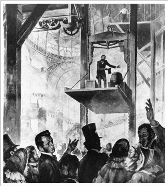 1853年,在美国纽约水晶宫举办的世博会上,奥的斯展示了他发明的安全升降机。