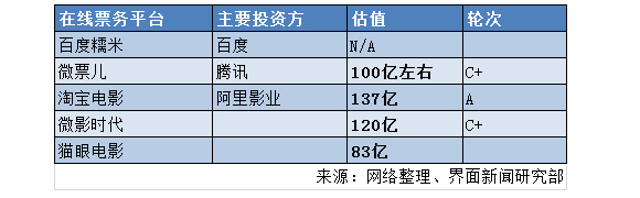 83亿的估值,在票务网站领域并不算高。根据界面新闻统计,当前票务网站是四分天下的格局。百度、阿里和腾讯三家互联网巨头分别投资了百度糯米、淘宝电影以及微票儿。而除了百度糯米的估值尚未对外宣布,微票儿和淘宝电影的估值则分别为137亿和120亿,远远高于猫眼电影83亿的估值。