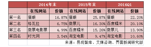 如果寻找王兴愿意“贱卖”猫眼的原因,猫眼最近前后夹击的市场份额可能是其中之一。猫眼电影自2014年开始就已经在票务网站中占有老大的位子,但是随着BAT相继加入战场,猫眼在烧钱方面比不过巨头的财大气粗。眼下,猫眼电影在线票务方面先发优势已经逐渐削弱,2016年第一季度的市场份额竟然有略微下降的趋势。